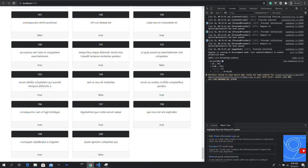 Taking a look at the console, we see that an array of 200 objects is being displayed. This same object has been rendered and displayed on the left side of the screen.